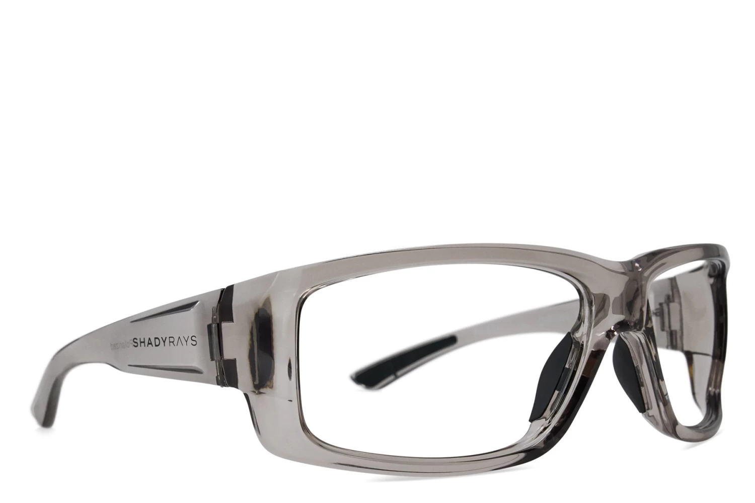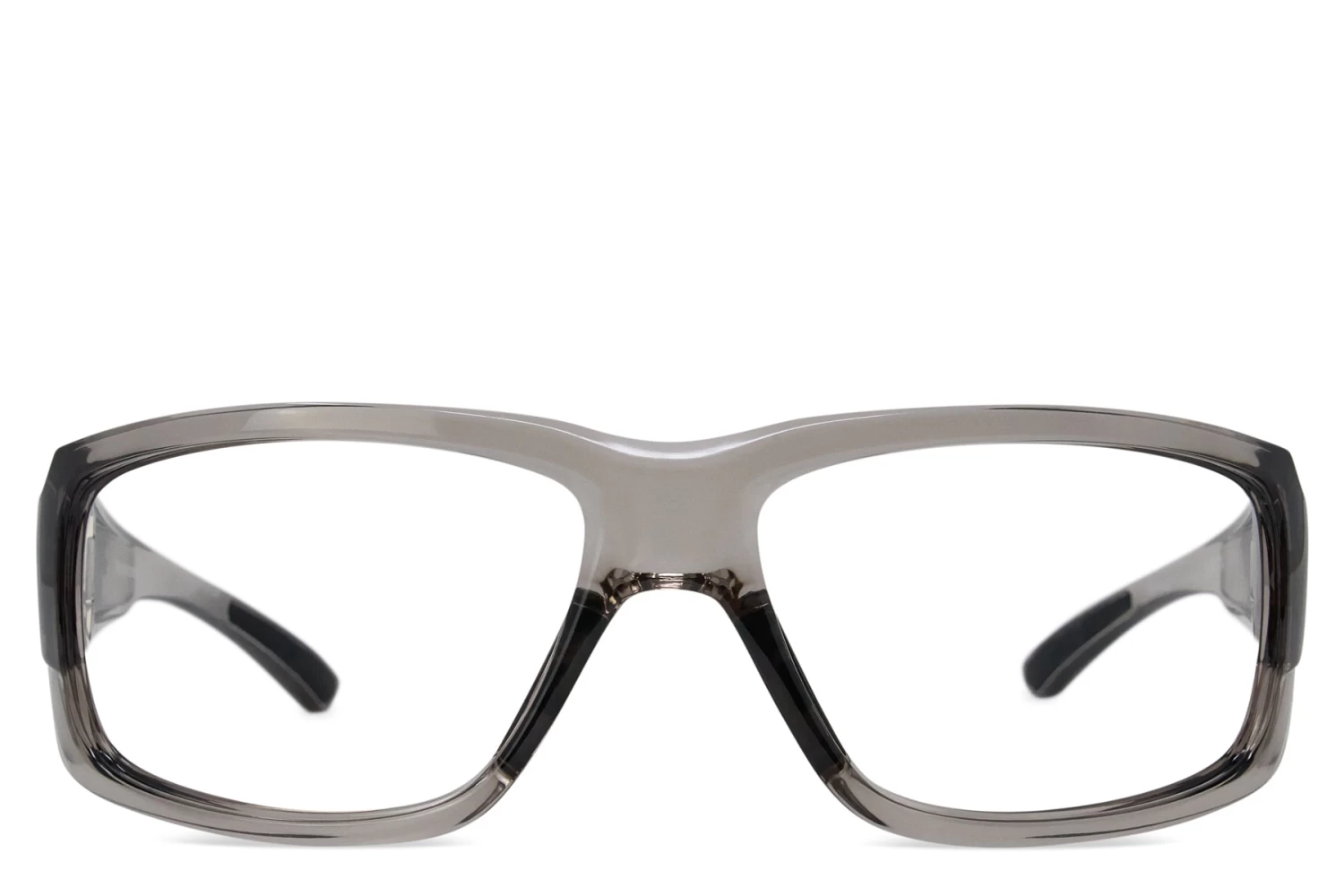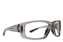 Translucent smoke grey TR-90 wrap frame with raised logos, complete with prescription lenses custom-made for you in our US-based optical lab. Includes signature hard case.