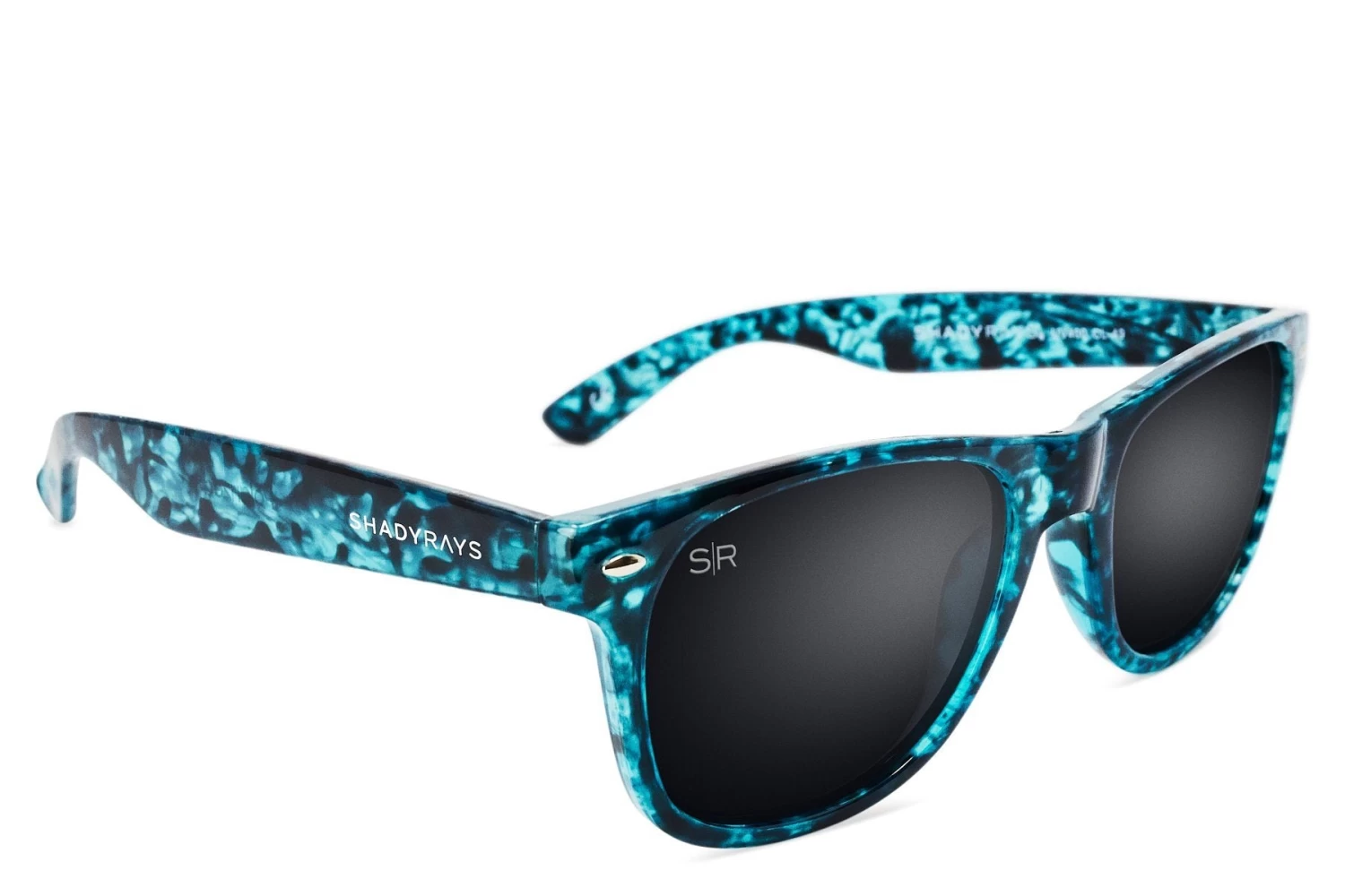 - Recycled Material Gloss Blue-Green Tortoise frame with polished metal hinges and metal Shady Rays emblem.