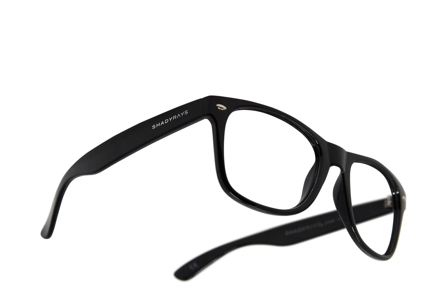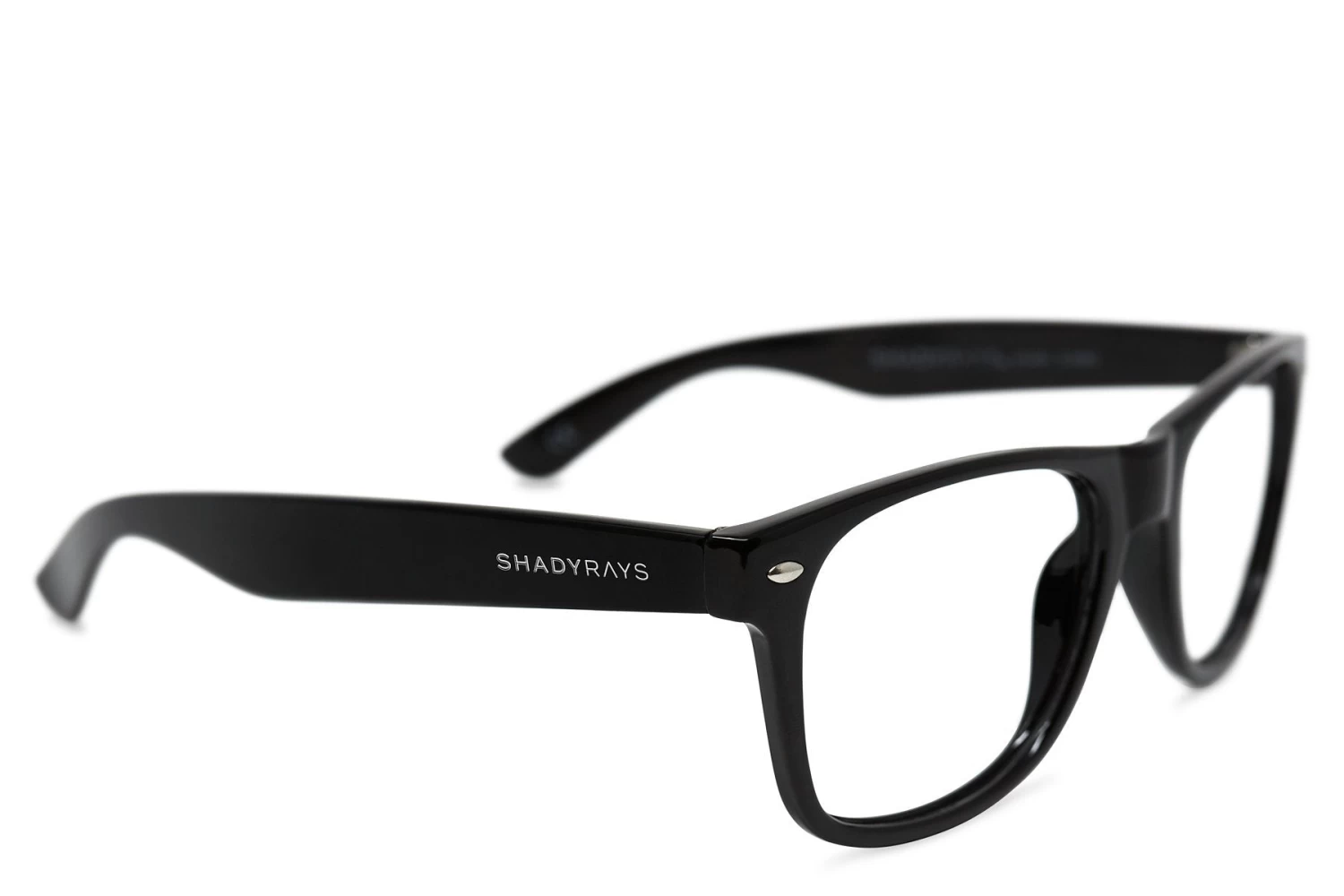 Gloss black frame with polished metal hinges and metal Shady Rays emblem complete with prescription lenses custom-made for you in our US-based optical lab. Includes signature hard case.