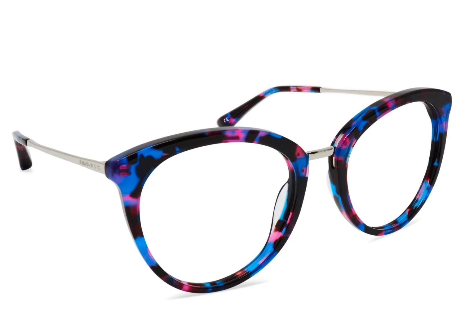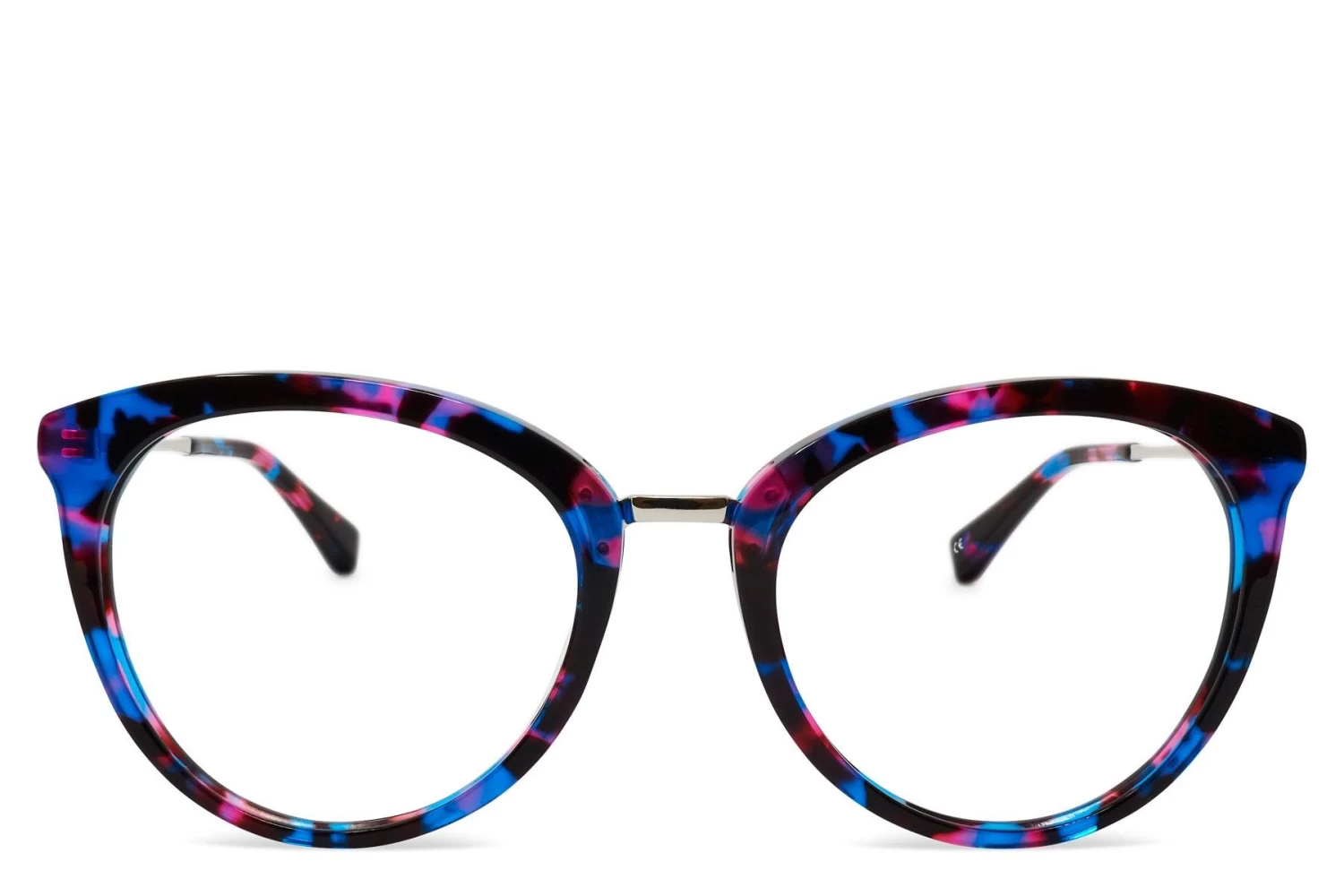 A large-lens, round frame with cat eye influence, made of premium acetate with silver metal accents. Complete with prescription lenses custom-made for you in our US-based optical lab. Includes signature hard case.