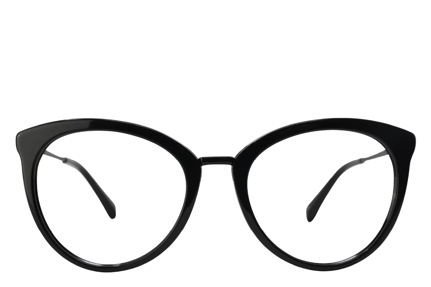 A large-lens, round frame with cat eye influence, made of premium black acetate with black metal accents. Complete with prescription lenses custom-made for you in our US-based optical lab. Includes signature hard case.