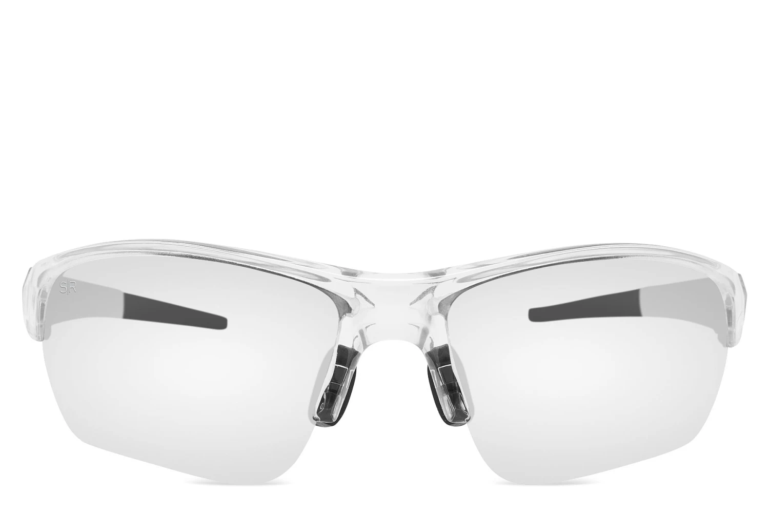 Durable gloss clear, 8-base wrap-around frame with custom geometric design and black logo, complete with prescription lenses custom-made for you in our US-based optical lab. Includes signature hard case.